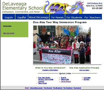 I designed and developed the web site for a dual immersion program housed at DeLaVeaga Elementary School. The Dos Alas Dual Immersion Program was established six years ago as stand-alone program within in the Santa Cruz County Schools district. The program aspires to provide resources that will inform current and prospective enrolleeās families about the dual immersion instructional model and communicate site-specific information. Internet-based resources allow parents and guardians to learn more about the instructional model at their convenience, are cost effective, and can be updated with less effort than hard copy handbooks. During the initial meeting with the school's principal, I agreed to redesign and develop the website for DeLaveaga Elementary School in addition to the working on the dual immersion program's web site.